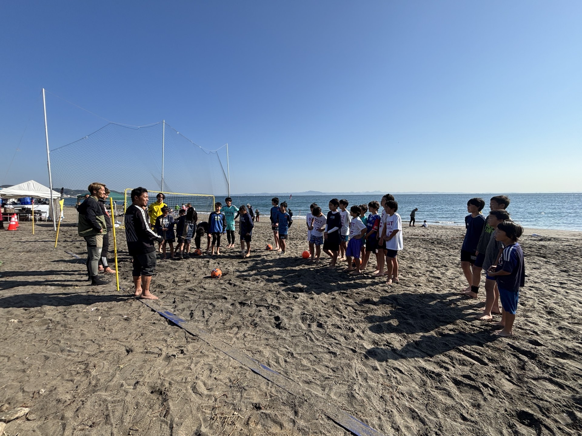 ビーチクリーンの後、11時から開会。 午前中は1時間ほどの時間をかけて、ビーチサッカークリニック。 今日は平間くんに加えて、東京ヴェルディBSからは日本代表でもある大場選手、レーヴェ横浜からは松本選手が駆けつけてくれて、子どもたちに指導してくれた。 世界的なプレーヤーたちと間近でふれあい、教えてもらえるというのもビーチサッカーの魅力だ。 子どもたちもさぞや触発されたのではないだろうか。