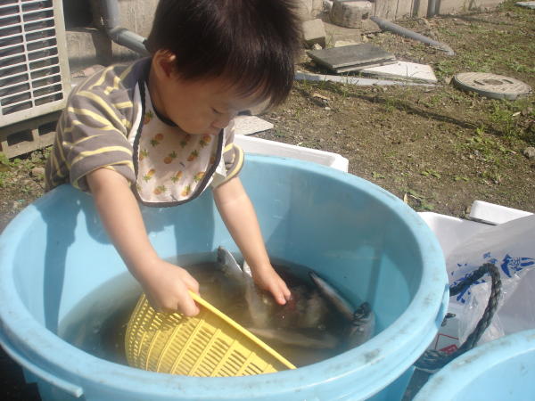 氷の冷たい水の中に手を入れてあじをすくっていました。大人でも冷たくて根をあげそうになるのに、根性ある!!