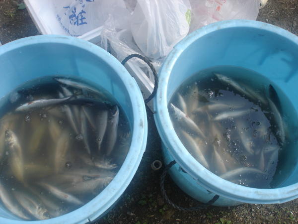 そんな中、漁師さんから大量のあじが届きました。ゴミバケツより大きなバケツに2杯。その量に圧倒されてしまいます。