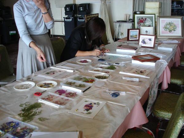 先生が用意してくれた押し花を並べるのですが、なかなかイメージどおりにはいかなくて悪戦苦闘。