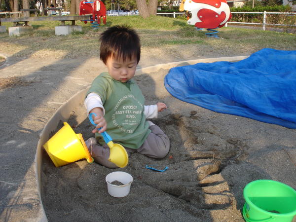ハジメは、一生懸命バケツやらコップやらにお砂を入れて、私に