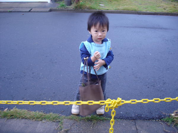 [写真:早く出かけたくてばばちゃんのかばんを離さないハジメ]