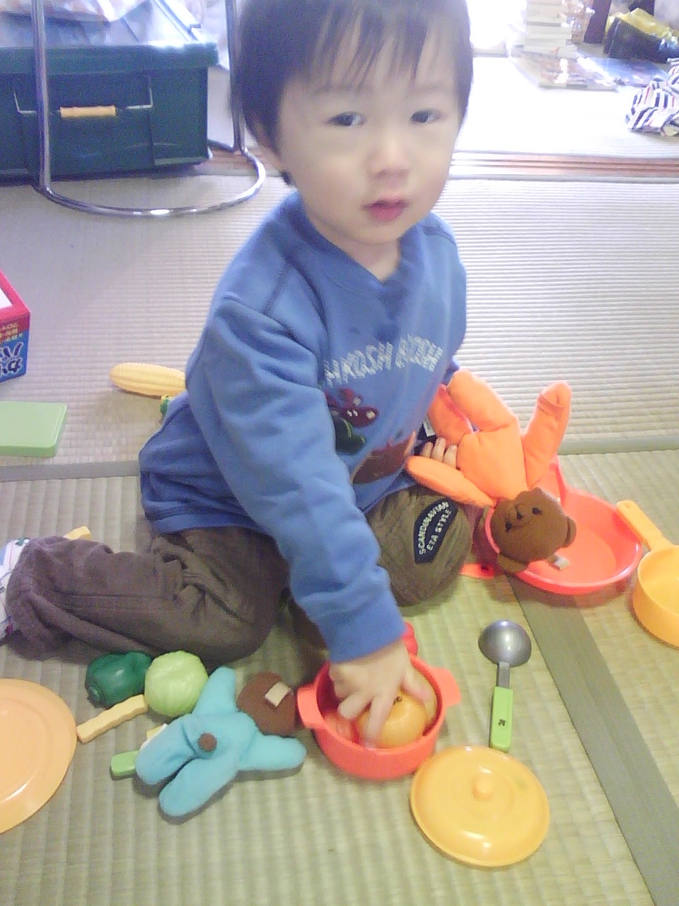 だんだん、バージョンアップしてきて、おままごとセットを無造作に置いて、階段を降りたあとは、おままごとセットのところへ行き、もぐもぐと野菜を食べさせます。