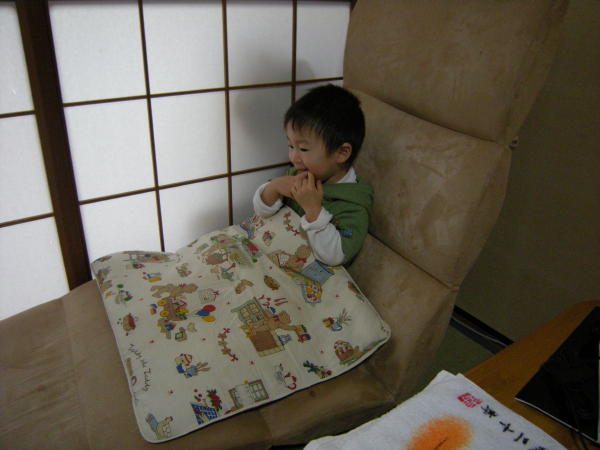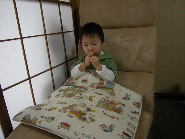 [写真:何故か座布団を毛布代わりに・・]