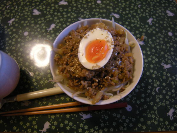 5.あつあつご飯に、もやしをのせて4をのせ、その上に2で作った卵を落とす。