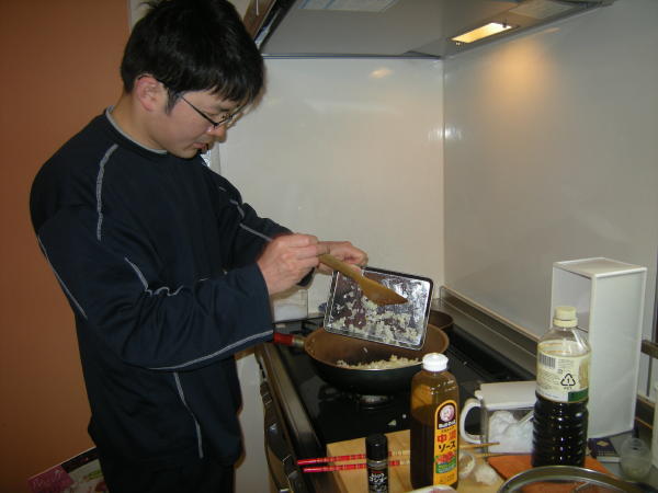 4.フライパンにごま油をひき、ひき肉を炒め、3をいれてさらに炒め、しょうゆ・砂糖・ソース・塩・こしょうにて味付けをする。(味付けは適当らしい)