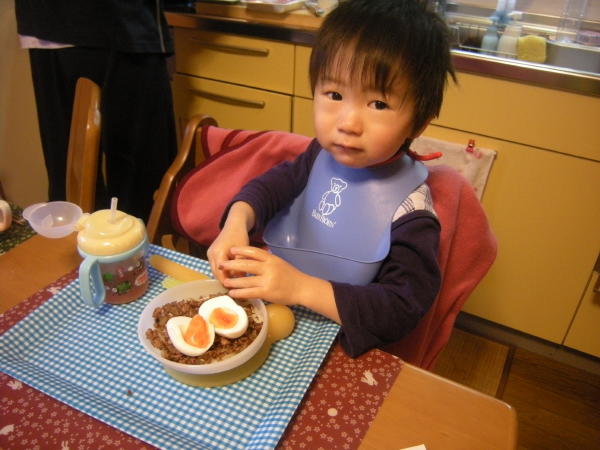 ※こちらは温泉卵風に作りたかった模様。沸騰したら火をとめて5分としたら硬すぎたようです。