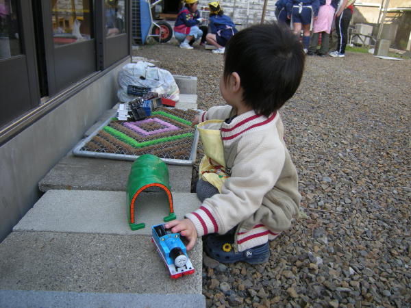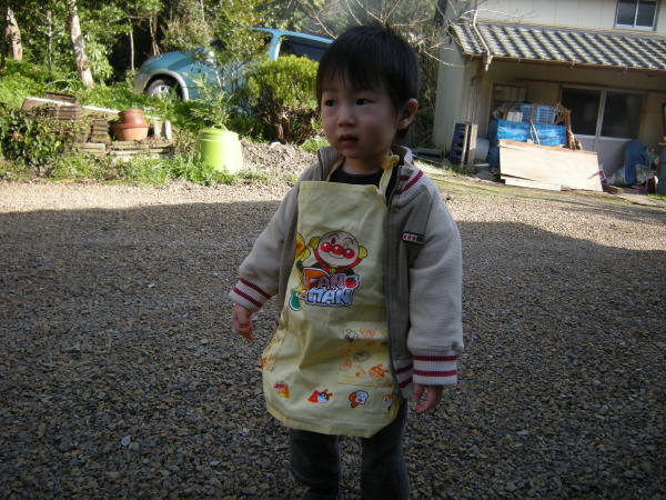 お姉ちゃんおにいちゃんと同じようにエプロンつけて、最初は嫌がっていたのにそのうち自分からエプロンをつけて外に飛び出していました。