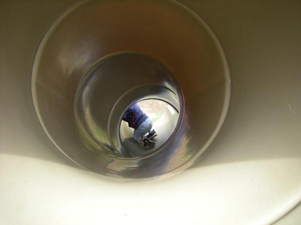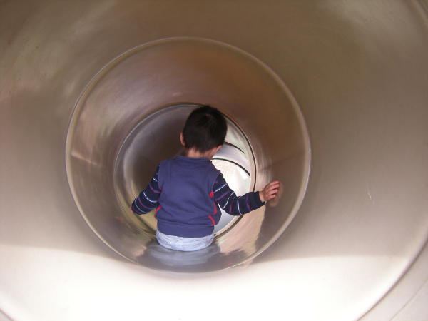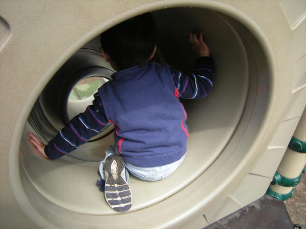 よくすべっていたすべり台で何度もすべり、それじゃ物足りないらしく少し大きい子用のアスレチックに行き、筒型のすべり台へ。