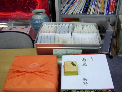 新野君のご実家から、大量に内祝いが贈られてきて、スタッフ一同びっくり!最中が72個もあった。すごいぞ、これは。