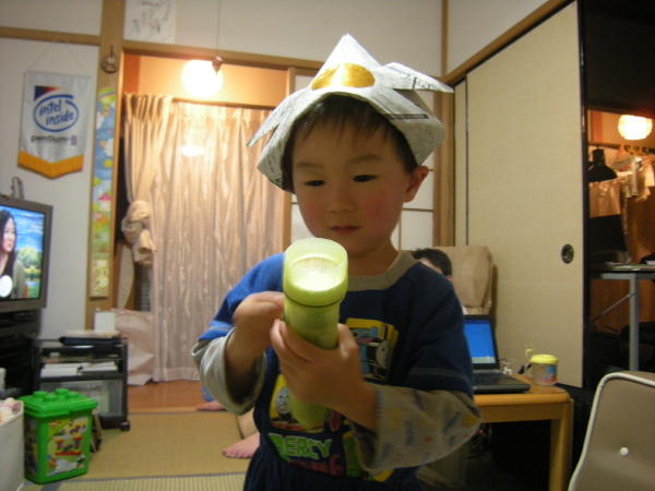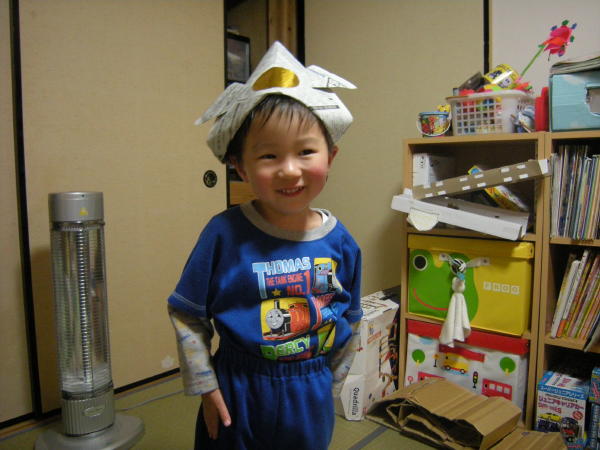 先日キッズくらぶで、お昼寝してしまったために、かぶれなかった兜を家でかぶせてみると思いのほか気に入ったようです。