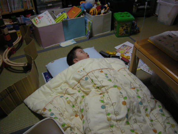 「はっちゃんひとりでねるんだよ」と言いながら、レジャーシートをひっぱりだして敷きだし、その上に自分の枕と布団を持ってきて寝転びます。