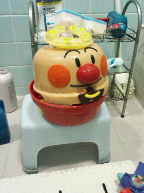 お風呂に入っていたら、ハジメがおもちゃと風呂イスなどでせっせと何かを作っていた。