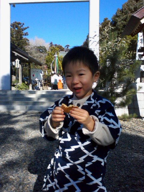 写真は2日に神社に出ている屋台の大判焼きを食べているところです☆嬉しそう。
