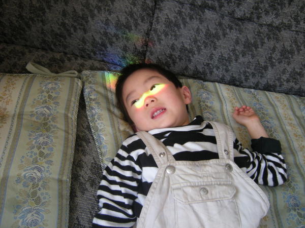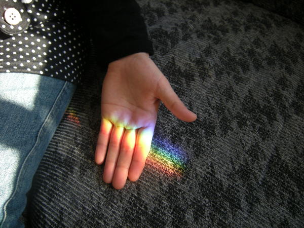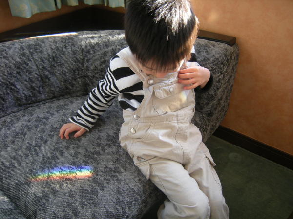 ※写真は関係ありませんが、応接間のガラスの置物によって出来た虹に喜ぶハジメです。