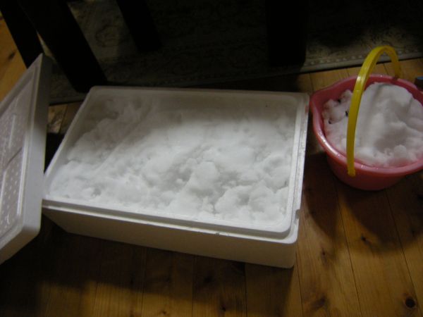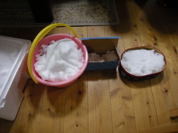 雪を持って帰ってくれというと、バケツやら発泡スチロールやら、色々もって行き持ち帰ってくれました。