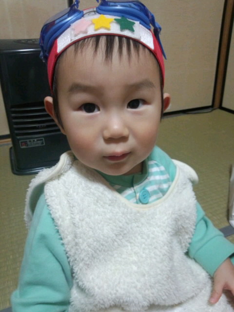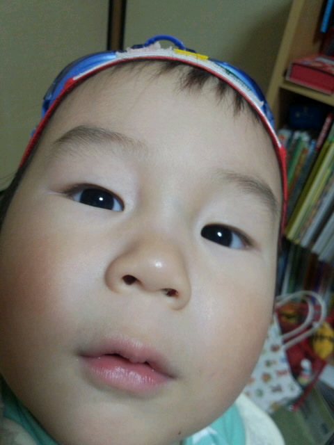 何やらおもちゃで遊んでいたら 多分サングラスのおもちゃで連想したのか突然思い立ち、ハジメのプールセットを出せと言い、出したら出したで帽子と水中メガネをつけろと指示し、携帯カメラを指差したので撮影タイム!