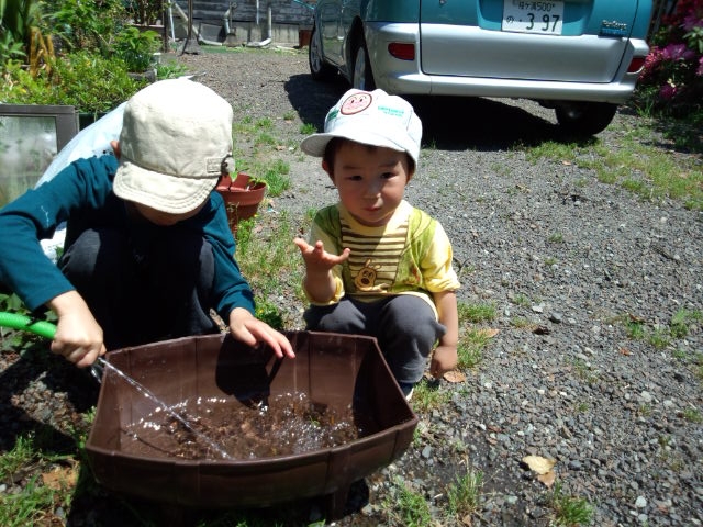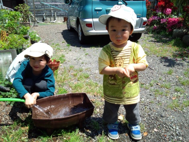 午前中に、ひまわりの種をハジメとミッキーとプランターに植えました。