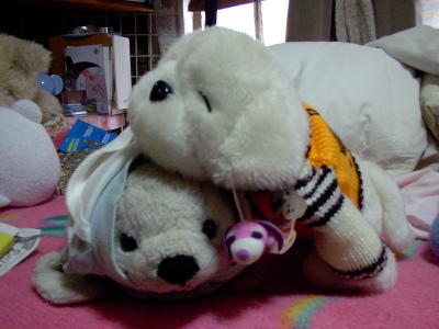 いぬがおにゅぅのふくをきせてもらったよ、ぼくもほしい・・・。