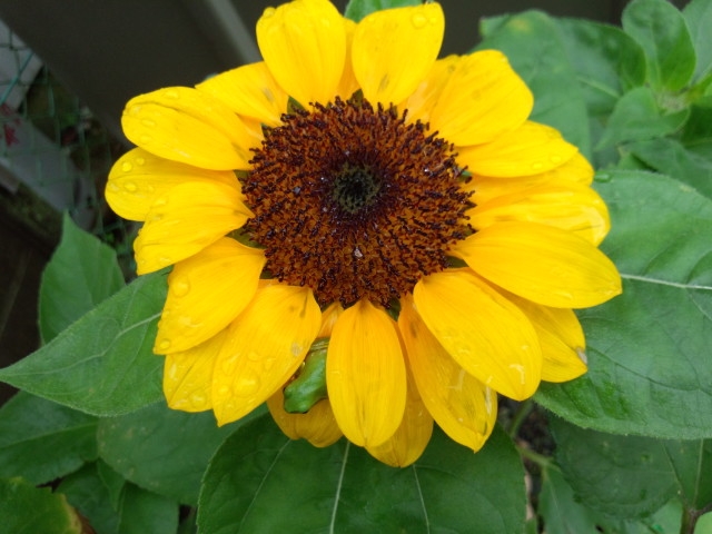 かえるちゃんが、ひまわりの花びらの陰に隠れていました。