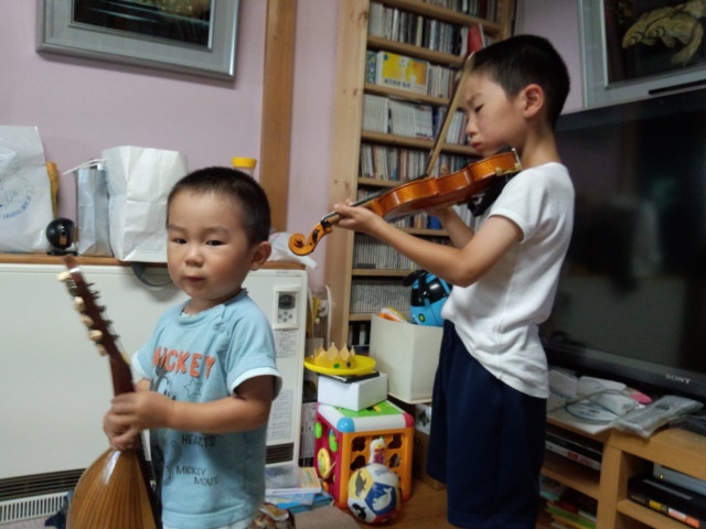ハジメがバイオリンを弾き始めると、自分も!!と何やら楽器を探し始めます。