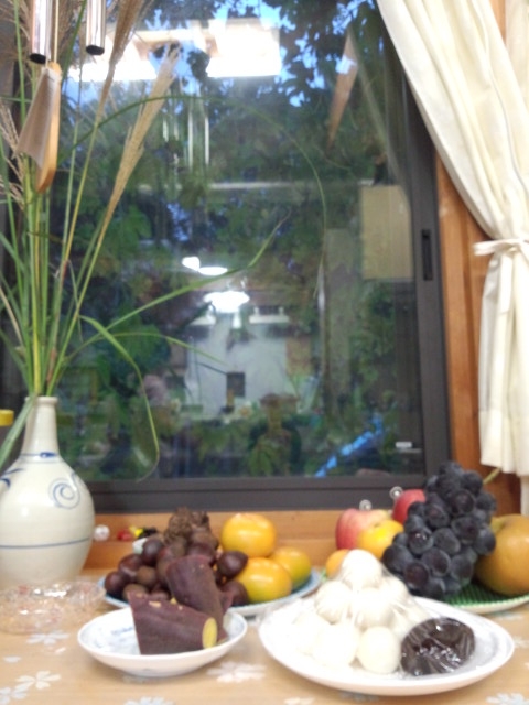 とりあえず、丸いお盆にお月様へのお供え物並べ、ススキも花瓶に入れて窓際へ。