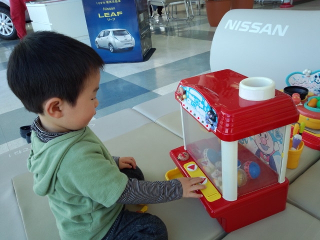 ミッキー連れでどうしようかと思ったのですが、日産に置いてあったおもちゃにかなりはまって、助かりました..。