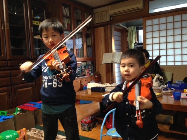 バイオリンのおもちゃ(これが結構よくできている!)をもっていて、