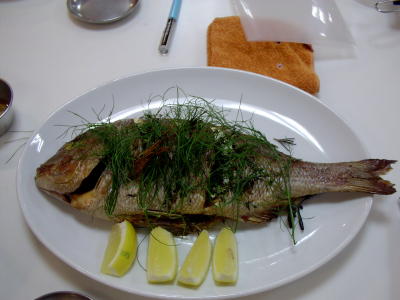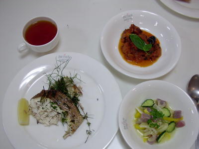 本来なら「すずき」のハーブ焼きなのに、この暑さのせいで、すずきがとれず、鯛に変更。なんだかかえって得した気分?