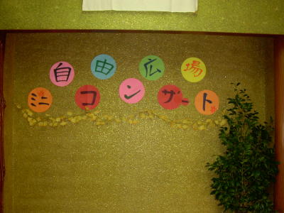 今回のフリーマーケットは「自由広場」と題し、地元のフルールという中高生の音楽集団が歌ったり、天津のお母さんが参加する 合唱団「神人和楽」が歌ったり、私がエレピアノを弾いたり、ミニコンサートも行われるので、舞台というか正面を飾りつけ。それも秋らしく仕上げてみた。