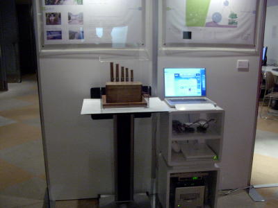 みっくんの作品は、入ってすぐのところに展示してあって、ネットワークの通信データを分析して竹筒の楽器で表すという作品だった。