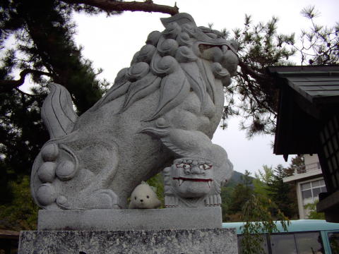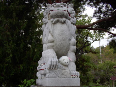 [写真:”じんじゃ”のおいぬさん はまったの・・。]