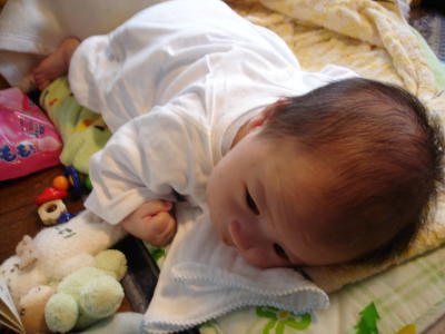 ご機嫌がよいので、「うつぶせ遊び」にチャレンジ。