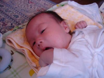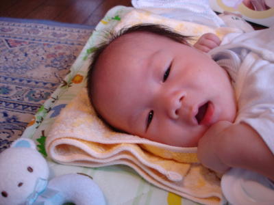 このころの赤ちゃんは、だんだん自分の手がわかるようになるとのこと。