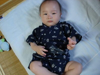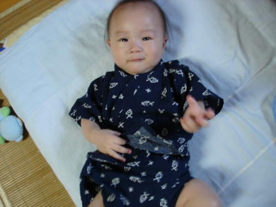 お祭なので、出産前から購入して着せるのを楽しみにしていた甚平を着た♪