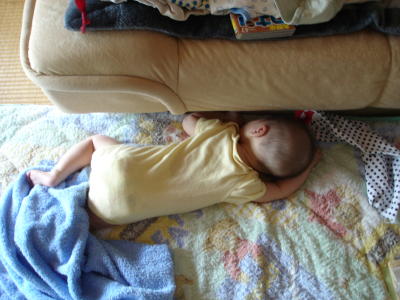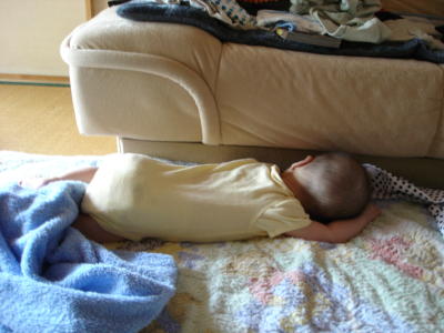 布団にちゃんと寝てたはずなのに、ふと見たらいつのまに寝返りをうって、ソファの下のせまいところにいた....