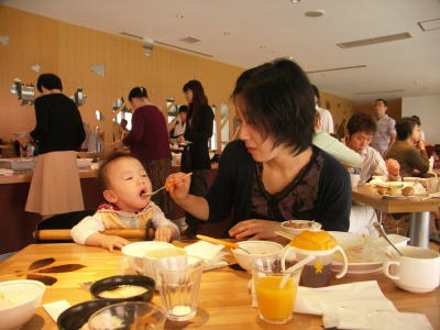朝ごはんのとき一緒にテーブルにつくと、何か欲しがって仕方がないので、まだ3回食にはしてないけれど、少しフルーツなどをあげるようにした。