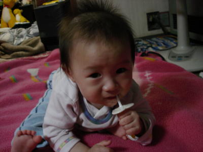 今月号のちゃれんじがちょうど歯みがきの特集で、9ヶ月ごろは虫歯になりにくく、歯みがきレッスンを始めやすい時期ということなので、早速ベビー用の歯ブラシを持たせてみることにした。