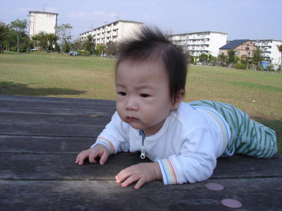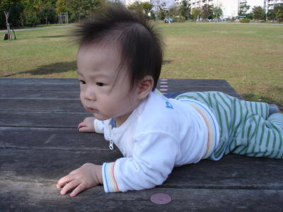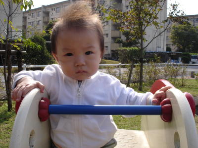 木のテーブルにも乗せてみたら叩いたりして喜んでいたけれど、やはり何かに気をとられているようで、じーーっと眼つけていた。