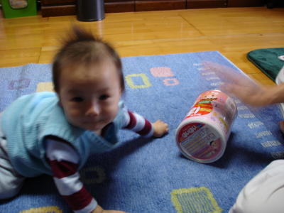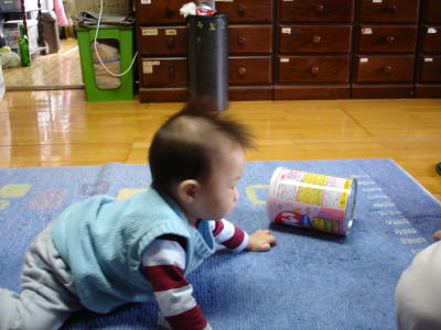 その1.使い切ったミルク缶にゴルフボールをいれてみた。1ついれると音をならしながら普通に動くけど、2ついれると動きが面白い。転がしては追っかけて遊んでいた〜。
