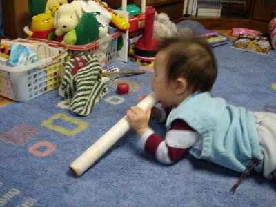 口にいれて「あーーー」と声出すことに夢中。声が変るから面白いらしい。