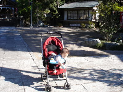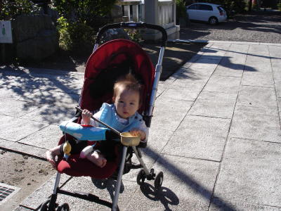 朝、皆が草むしりしている間、ハジメはベビーカーに乗って日向ぼっこ。