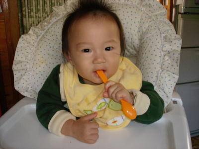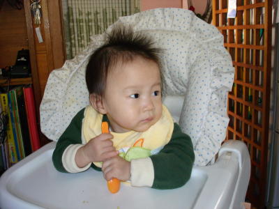調子よく4切れくらいつかみ食べ成功。その後は意欲を失ったのか、手を出してこなかったけど、これで一歩また大人への階段をあがったような気がする。(「大人へ」ってのは言い過ぎかもしれないけど)