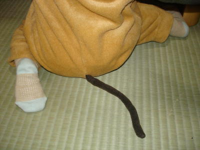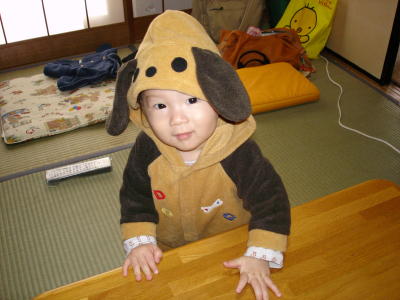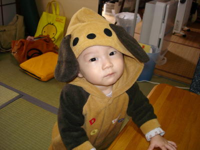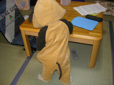 頂き物で犬の着ぐるみがあったのを忘れていて、着ないと着られなくなっちゃう〜っということで意味もなく着せてみた。