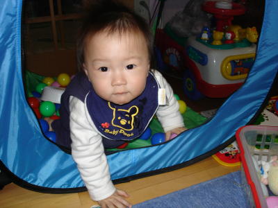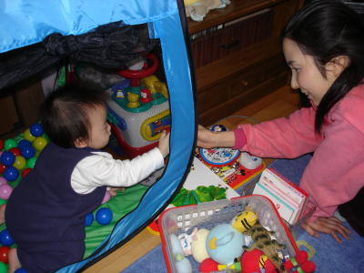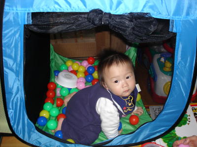 「ボールハウス」の中に入っているたくさんのボールのおかげか、いつの間にかボールを上手に投げることができるようになっている。