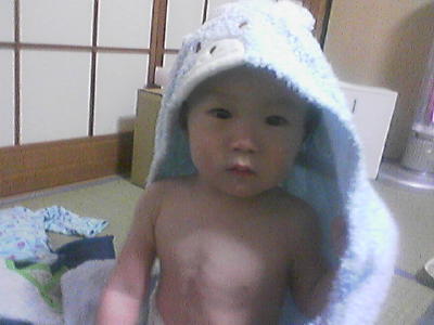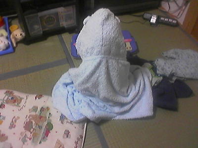 お風呂あがりも早くパジャマを着せたいのに、しばらく落ち着かないことがあって、そういうときはもうどうにもならないので、バスポンチョでくるんでしまう。