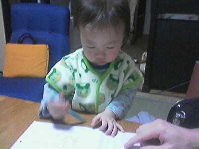 私が何か字を書いているとかなり興味を持って、ボールペンをうばうのだけれど、今まではそれで何かを書こうとしなかったのに、最近はなんだか慣れた手つきで持ち、しきりに書こうとする。