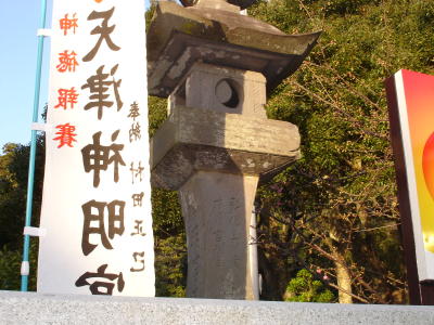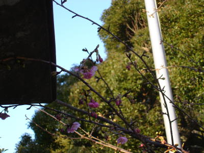 境内の燈篭の脇に河津桜があって、少し花が咲いています。