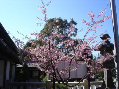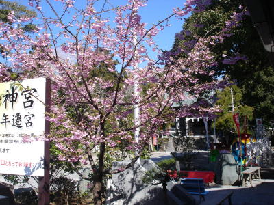 神社の境内の河津桜が、大体9分咲きくらいになりました。