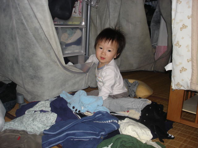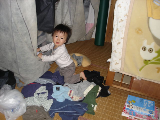 カラーボックスの引き出しの服を出して遊び始め、はまってしまったよう...